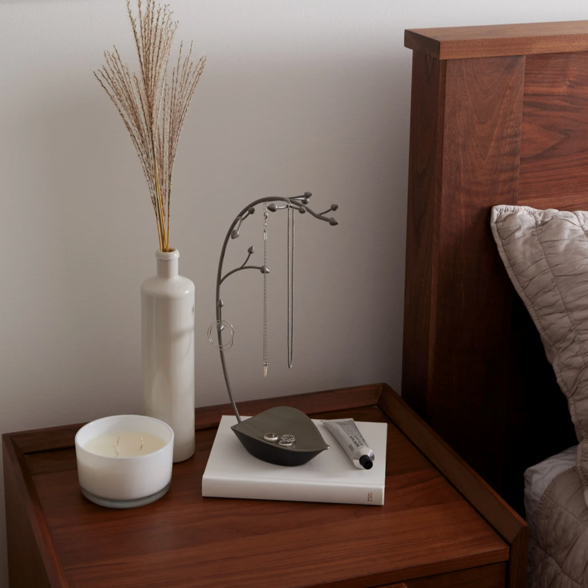 Powder coated metal jewelry tree with 12 hooks and a leaf shaped dish.